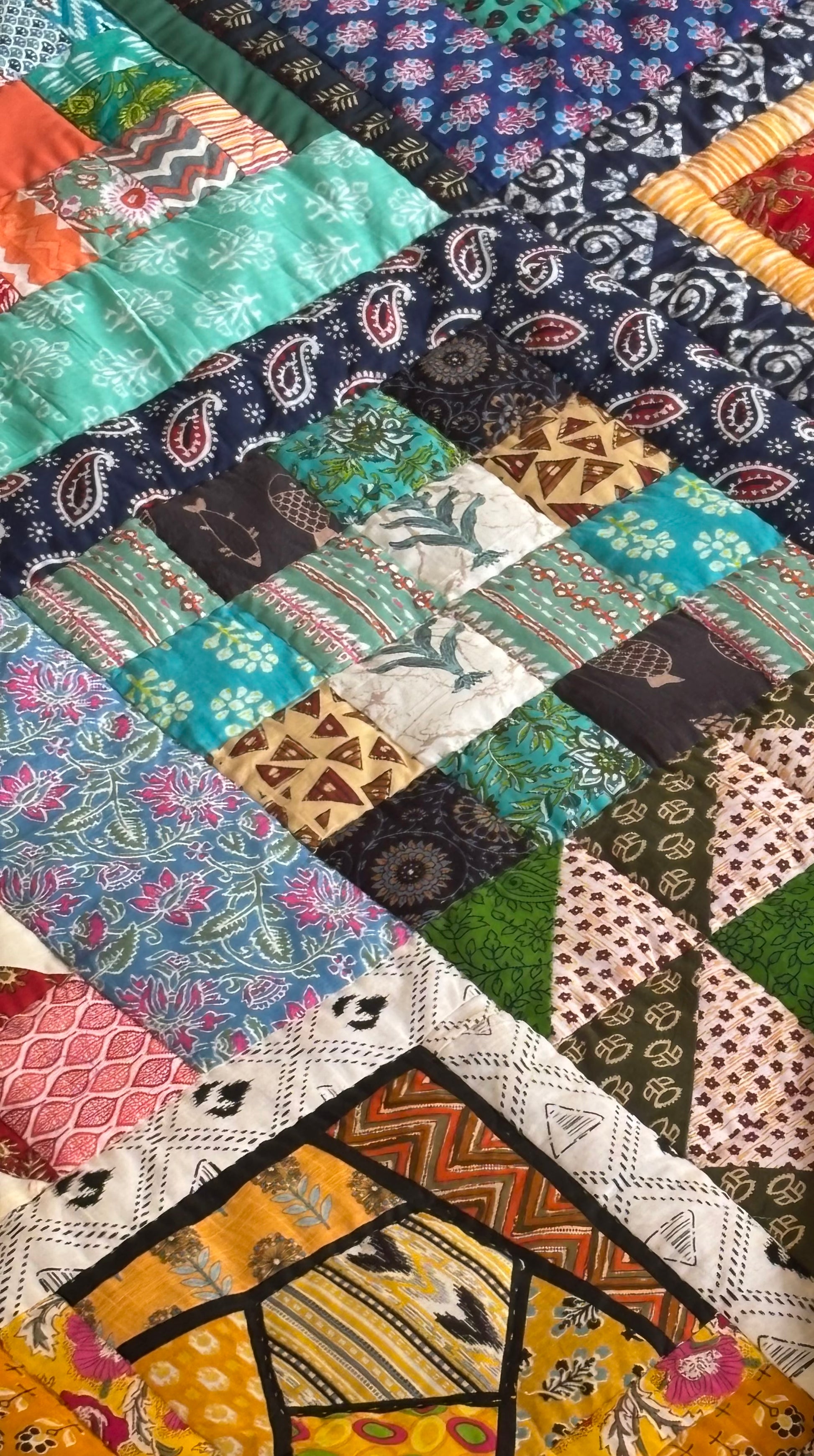 Crafted from 100% cotton, this handcrafted and hand-quilted Big Squares Quilt (97"x72") offers exceptional comfort and durability. Its reversible design features distinctive box patterns, making each piece a unique work of art. Suitable for all temperatures, including air-conditioned environments, it can also be used as a stylish bedspread, combining functionality with expert craftsmanship.